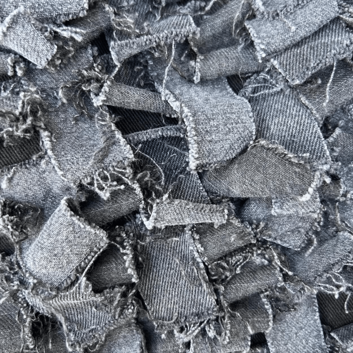 ghillie style denim upcycled from 5 pairs of jeans. features functional front pockets and individually cut and sewn greyscale denim strips. waist is 36in, inseam is 31in.